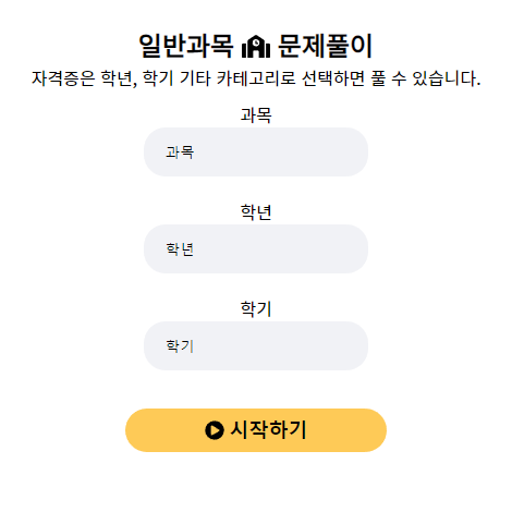 카테고리가 없다 보니 원하는 과목을 집어서(?) 풀기가 어려웠습니다. 과목, 학년, 학기 · 시험 차시 별로 카테고리를 추가했으며 HTTP API 구조를 해당 카테고리 조건에 맞는 모든 문제를 가져오게 변경하였습니다.