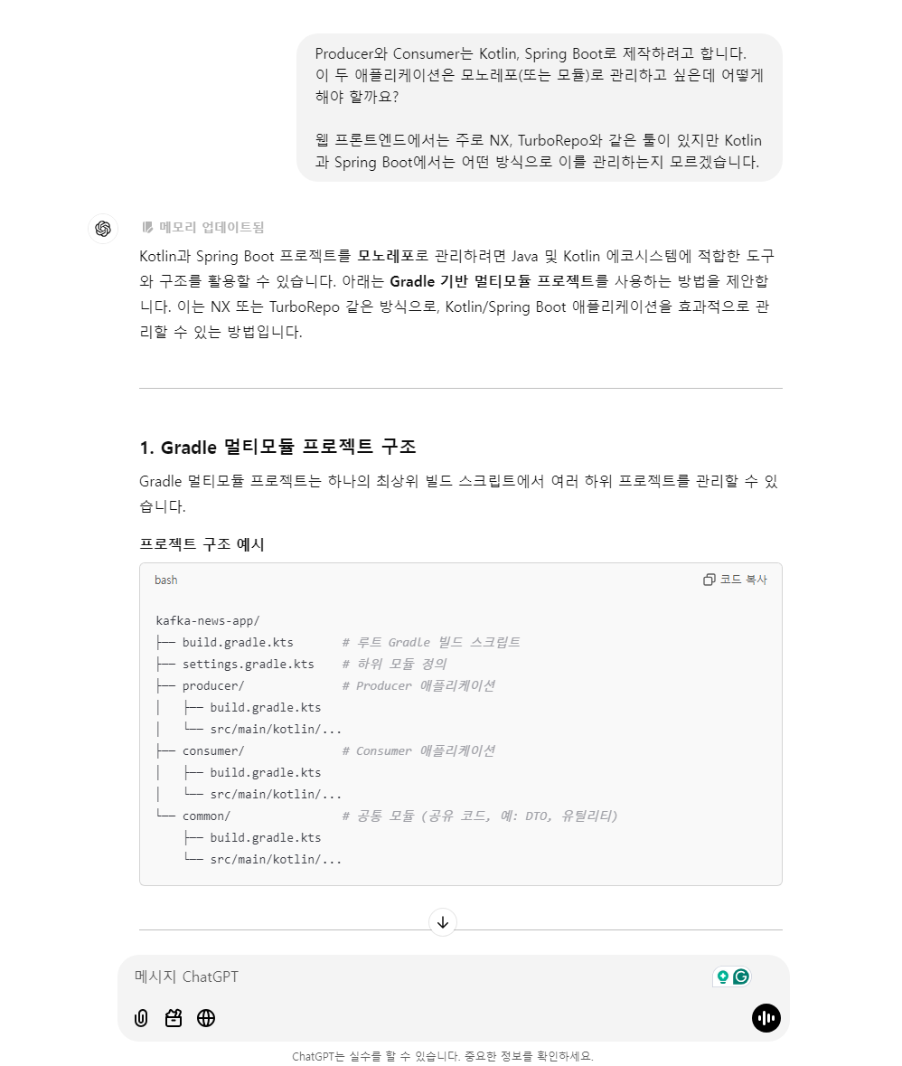 얼마 전에는 Apache Kafka를 배우기 위해 토이프로젝트를 진행했는데, 프로젝트 아이디어나 아키텍처를 조언받을 때 많음 도움이 되었습니다. LLM들이 흔히 '환각'이라고 하는 사실이 아닌 내용을 말해주는 경우도 있기 때문에 크로스체크를 어느 정도 필요할 것 같습니다.
