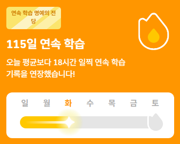 해외 자료나 전공 원서를 볼 때 좀 더 부드럽게? 읽히길 원해서 영어 공부를 하고 있습니다. 듀오링고도 위에서 말한 서비스와 같이 연속 학습이라는 이름으로 스트릭을 제공합니다. 현재 시점으로 듀오링고는 115일째 유지하고 있습니다!