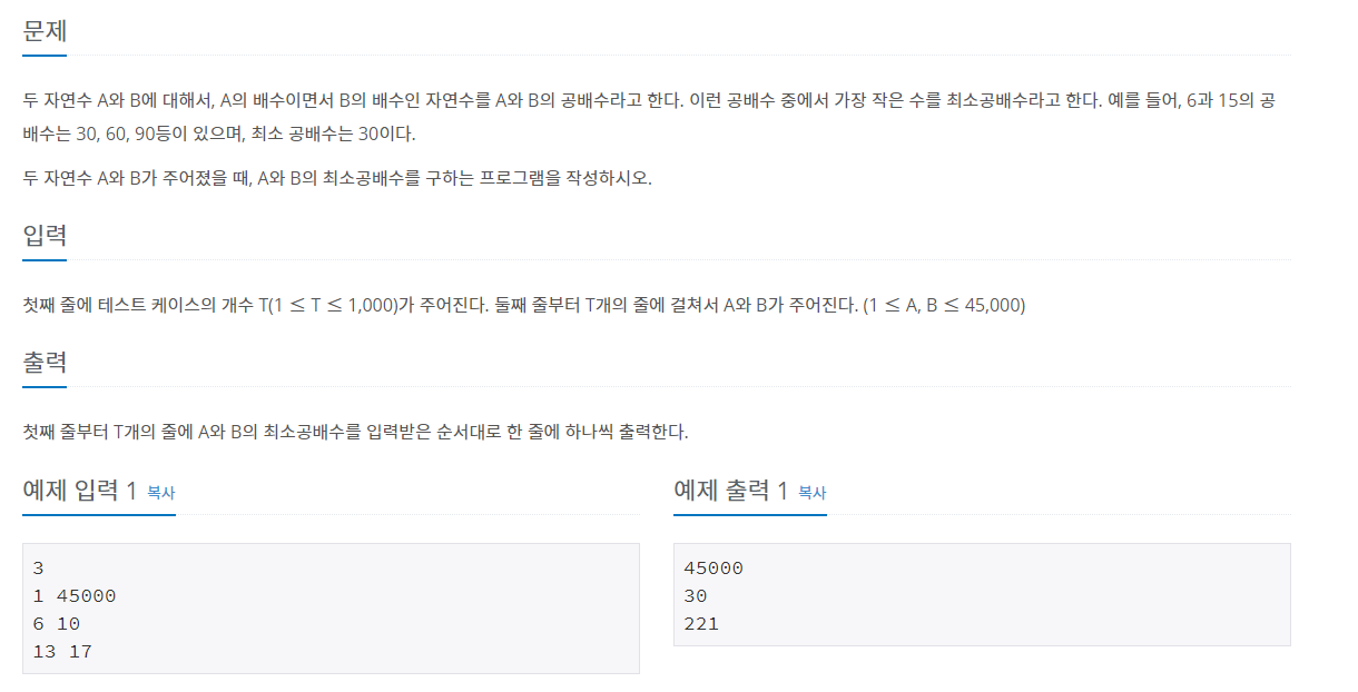 해당 문제는 테스트 케이스가 주어지고 A와 B의 최소공배수를 출력하는 문제입니다.