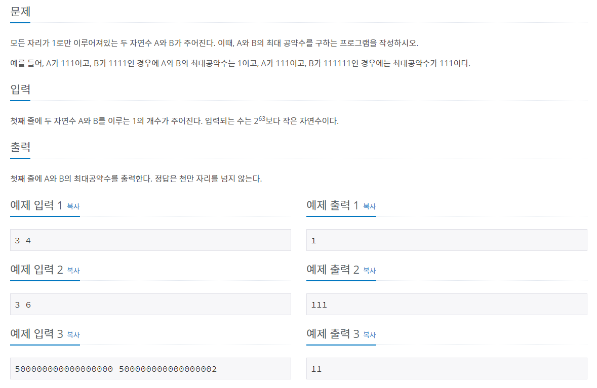모든 자리가 1로만 이루어져있는 두 자연수 A와 B가 주어진다. 이때, A와 B의 최대 공약수를 구하는 프로그램을 작성하시오. 예를 들어, A가 111이고, B가 1111인 경우에 A와 B의 최대공약수는 1이고, A가 111이고, B가 111111인 경우에는 최대공약수가 111이다.