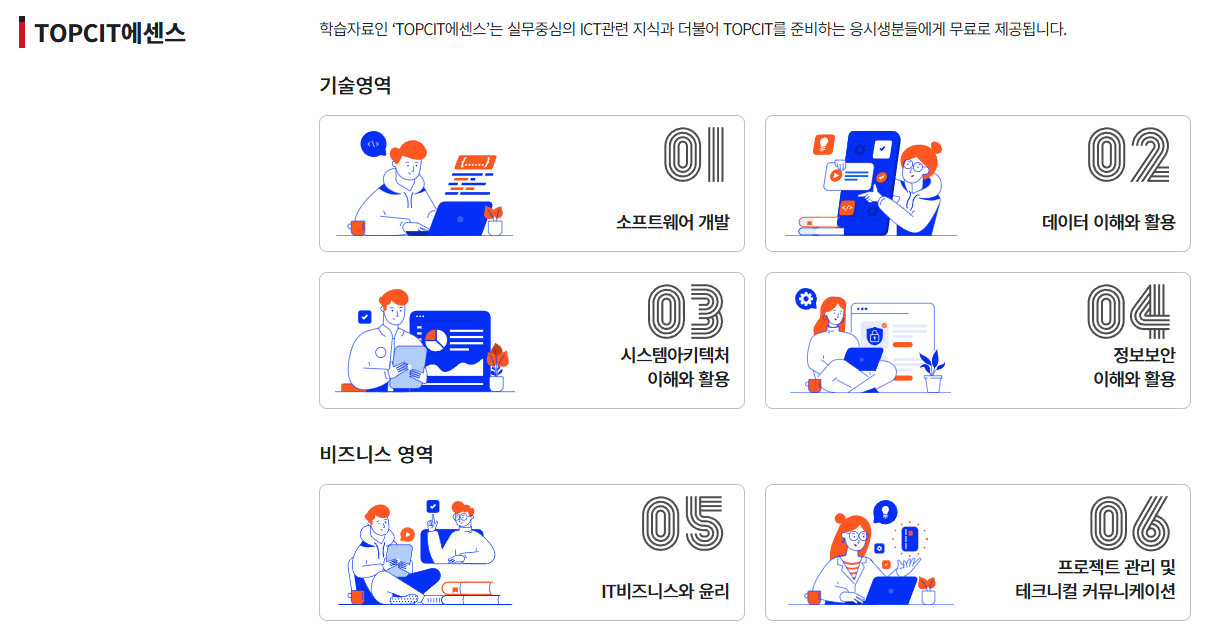 이게 최고의 공부 방법인지는 모르겠습니다. 당연한 이야기이긴 한데 TOPCIT 에센스에서 모든 내용이 나옵니다. 쭉 읽어보고 시험을 봐도 충분합니다. 다만 자료 분량이 너무 많습니다. 사진과 같이 여섯 개의 파트로 이루어져 있고 가장 큰 문제는 문법 오류나 오타가 너무 많습니다. 물 흐르듯 자연스럽게 읽을 수 있는 자료는 아닙니다. (관계자 여러분 혹시 보신다면 개선 부탁드립니다..)