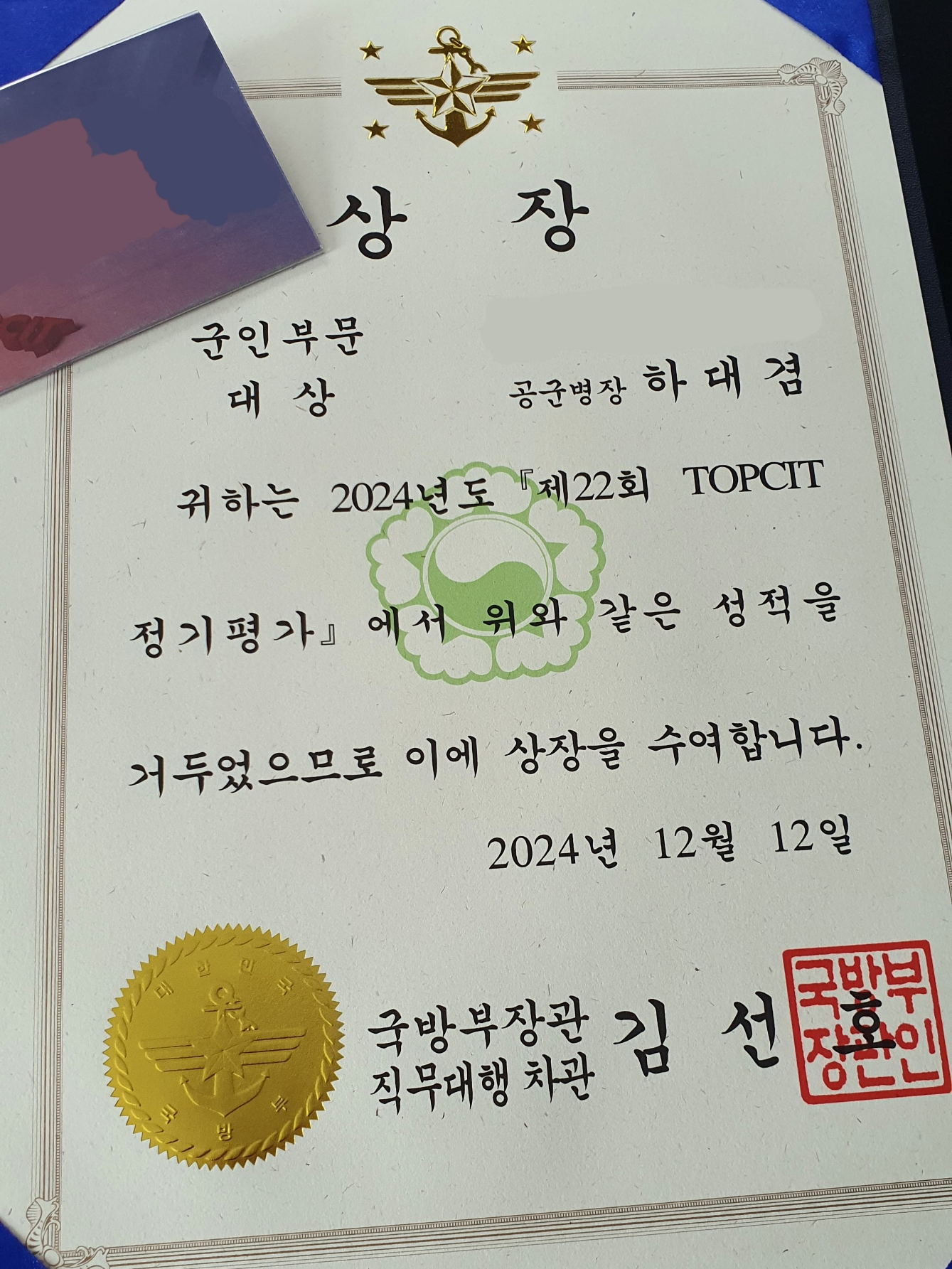 상반기는 아쉽게도 놓쳤고, 군인 응시자가 적어서일까요? 운 좋게도 하반기 시험에서 군인 부문 성적우수자로 선정됐고 국방부장관상을 받게 되었습니다.