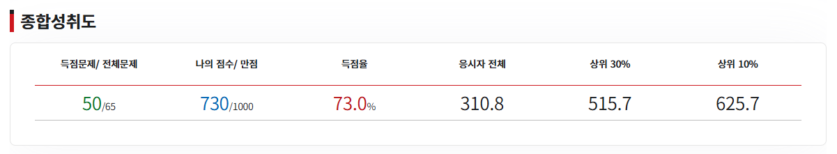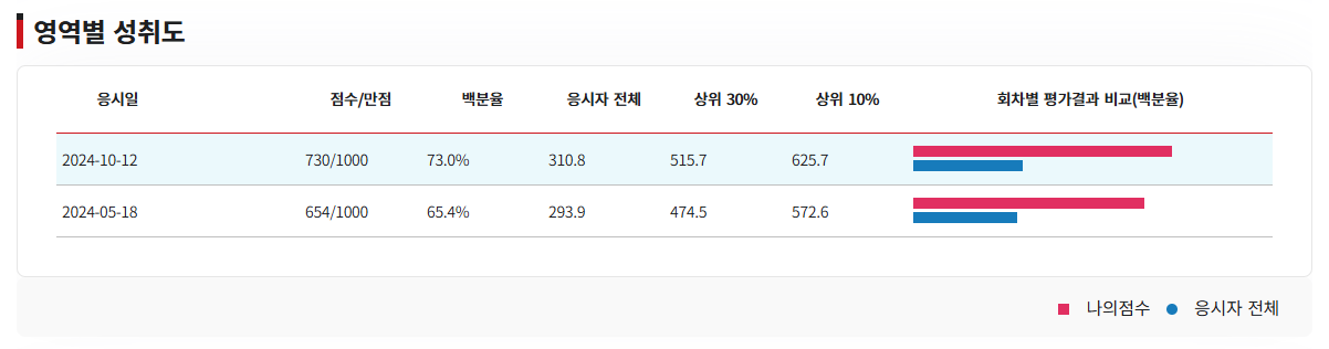 2024년 상반기에는 대학생 부문으로 시험을 봐서 654점이 나왔습니다. 하반기 때는 군인 부문으로 시험을 봤고 730점을 받았습니다.