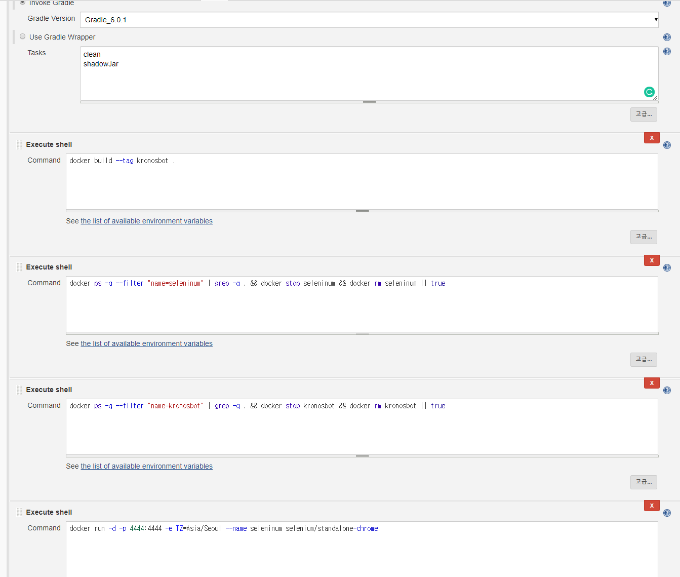해당 디스코드 봇은 Gradle로 빌드를 하기 때문에 clean 명령어와 shadowJar 명령어를 실행하게끔 추가했습니다.
