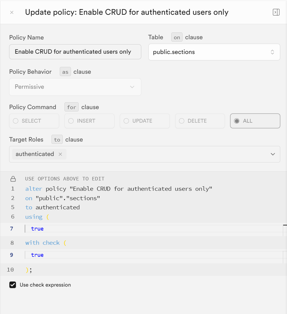 사진과 같이 모든 동작에 대해 로그인한 사용자만 사용 가능하도록 제한하고 `SELECT` 구문만 전체 사용자로 풀어주면 위에서 말한 권한 정책을 구현할 수 있습니다.