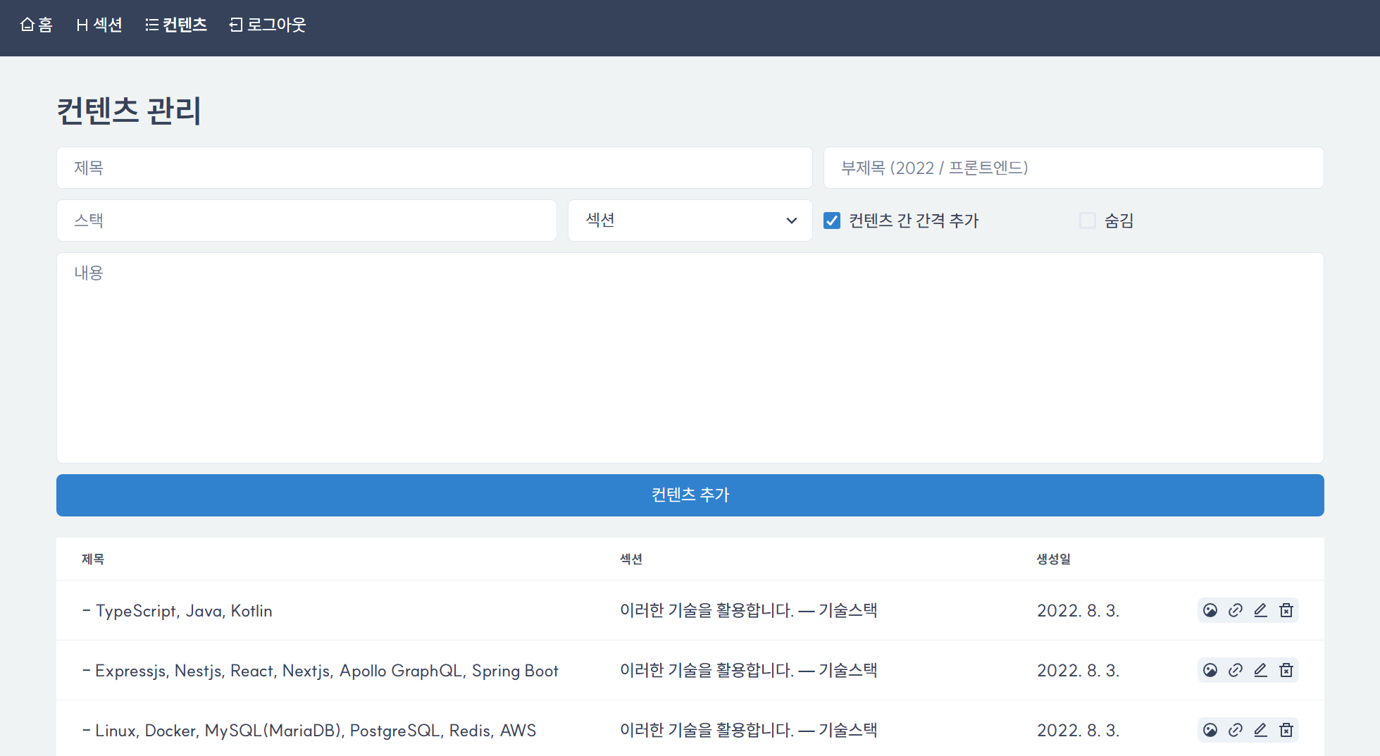 Supabase에 Markdown 뷰어(`react-markdown`)까지 적용해 주면 이제는 소스코드를 수정하지 않고 관리자 페이지에서 바로 콘텐츠를 수정할 수 있게 됩니다. 관리자 페이지의 경우 외부에 공개되지 않고 저만 사용하기 때문에 `chakra-ui`와 기존 색상 테마를 사용해서 간략하게 레이아웃만 잡아줬습니다.