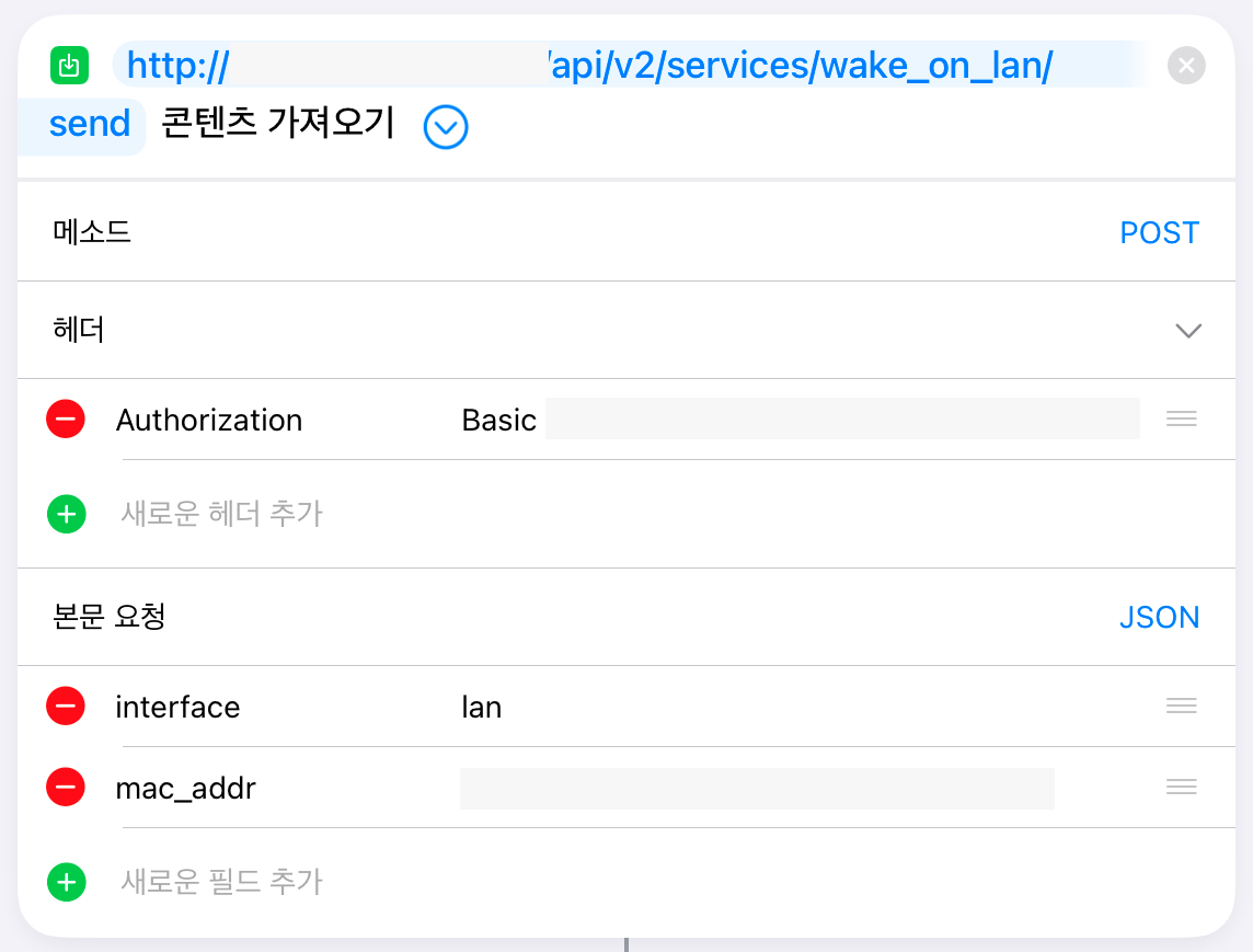 WOL API는 `POST http://<host>/api/v2/services/wake_on_lan/send` 으로 요청하면 됩니다. 이때 인증 정보를 헤더로 함께 넘겨줘야 하는데 특별한 설정을 하지 않았다면 Basic Authentication 방식을 사용해 주면 됩니다.