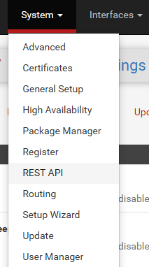 설치가 완료되면 System 메뉴에서 REST API 메뉴를 추가로 확인할 수 있습니다. 이후 REST API 메뉴에서 Enable 체크박스를 체크해 주면 pfSense API를 사용할 수 있게 됩니다.