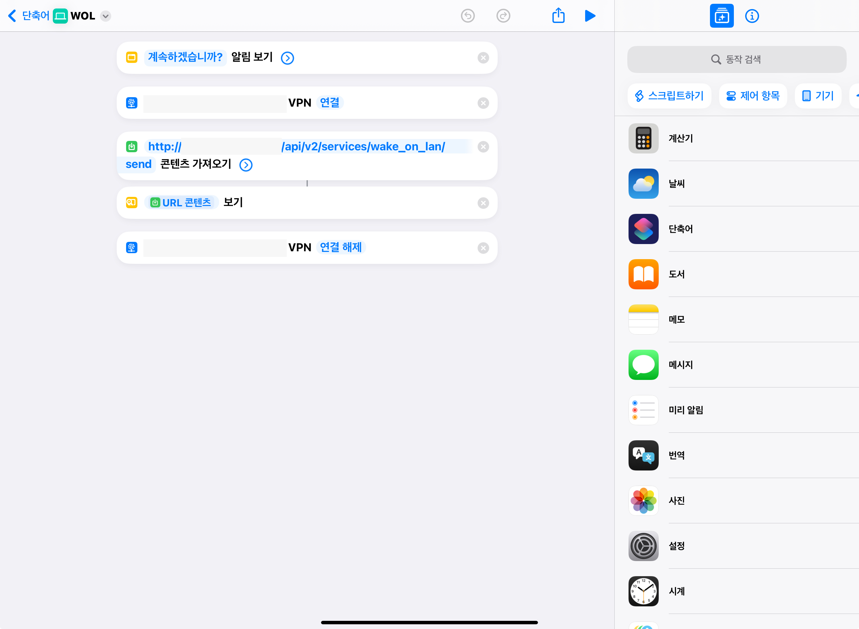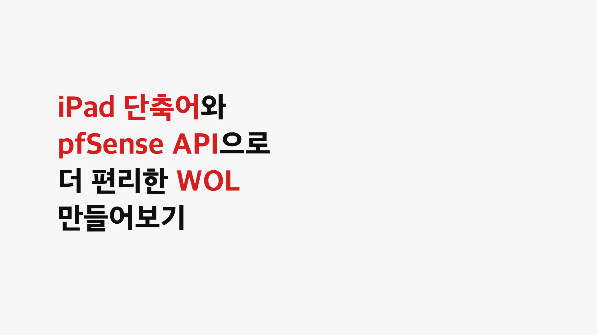 iPad OS(또는 iOS)에는 단축어라는 기능을 제공합니다. 단어 뜻 그대로 특정 행위에 대한 단축 기능을 만들어주는데, 이 중에는 VPN 연결 & 연결 해제 기능과 API 요청을 보내주는 기능이 있습니다. 이 두 가지 기능과 pfSense API를 사용해서 WOL 단축어를 만들어보겠습니다.