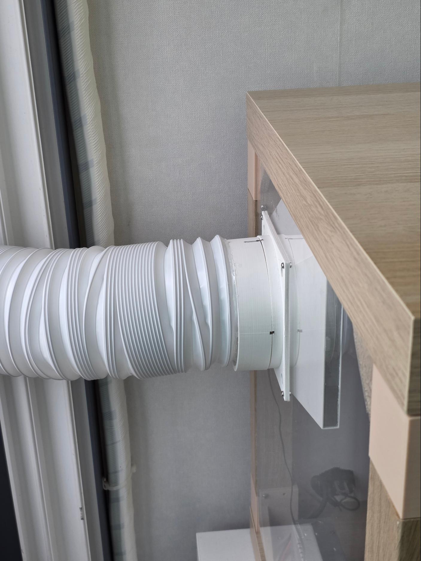 창문과 연결된 주름관을 통해 챔버 내부로 창문 밖 공기가 다시 들어오는 문제가 생길 수도 있을 것 같습니다. 당장 사용하는데 큰 문제는 없는데 외부 온도 영향으로 출력물 품질에 영향이 갈 수 있습니다. 본격적인 겨울이 되면 알 수 있을 듯한데, 문제가 생기면 공기 역류를 댐퍼를 달아줄 계획입니다.