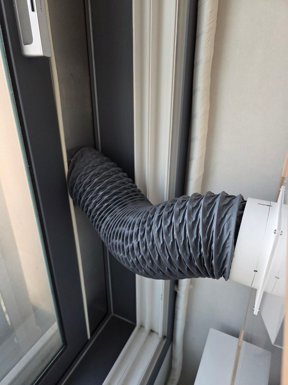 이제 배기한 공기를 주름관을 통해 밖으로 내보냈습니다. 창문 밖으로 주름관을 빼기만 하면 나머지 막지 않은 틈으로 다시 들어오기 때문에 (직전 사진처럼) 창문의 모든 틈을 막아줘야 합니다.