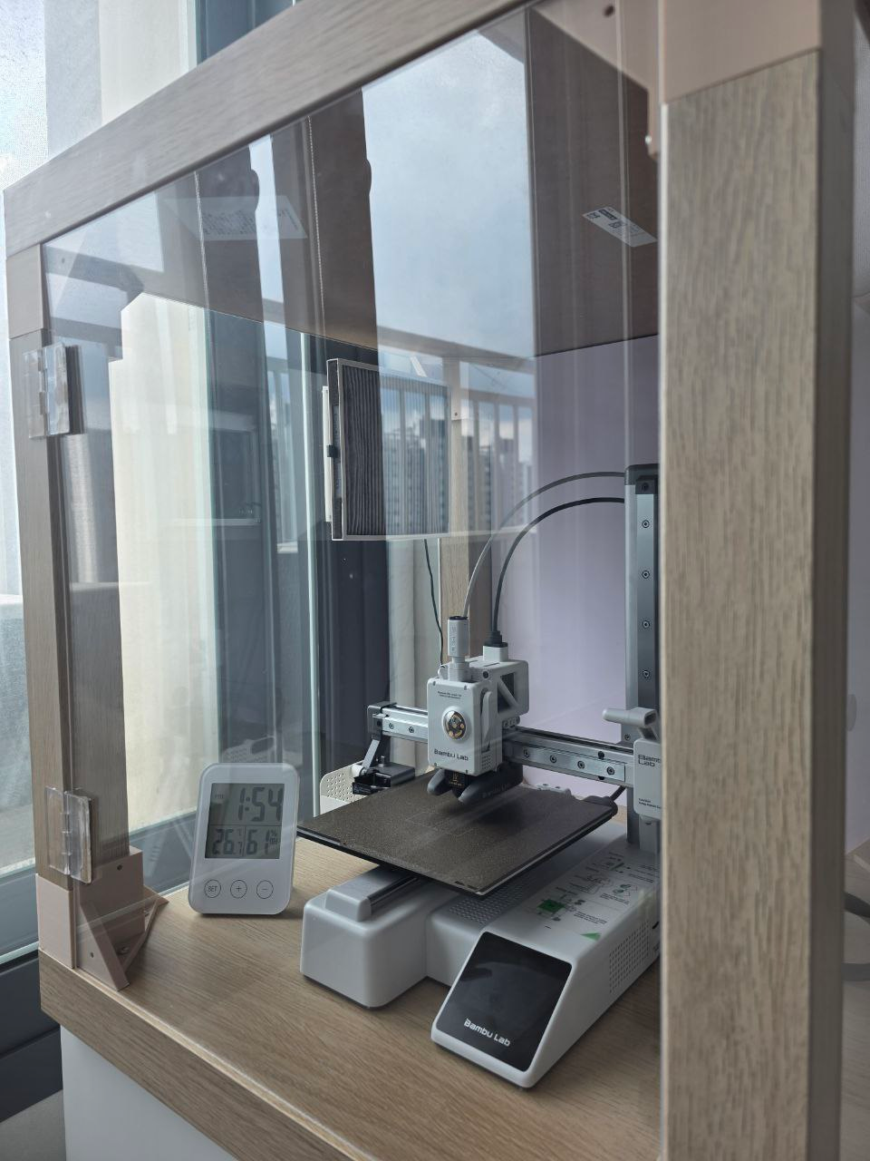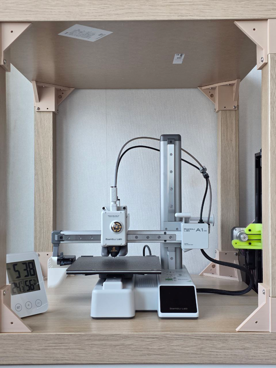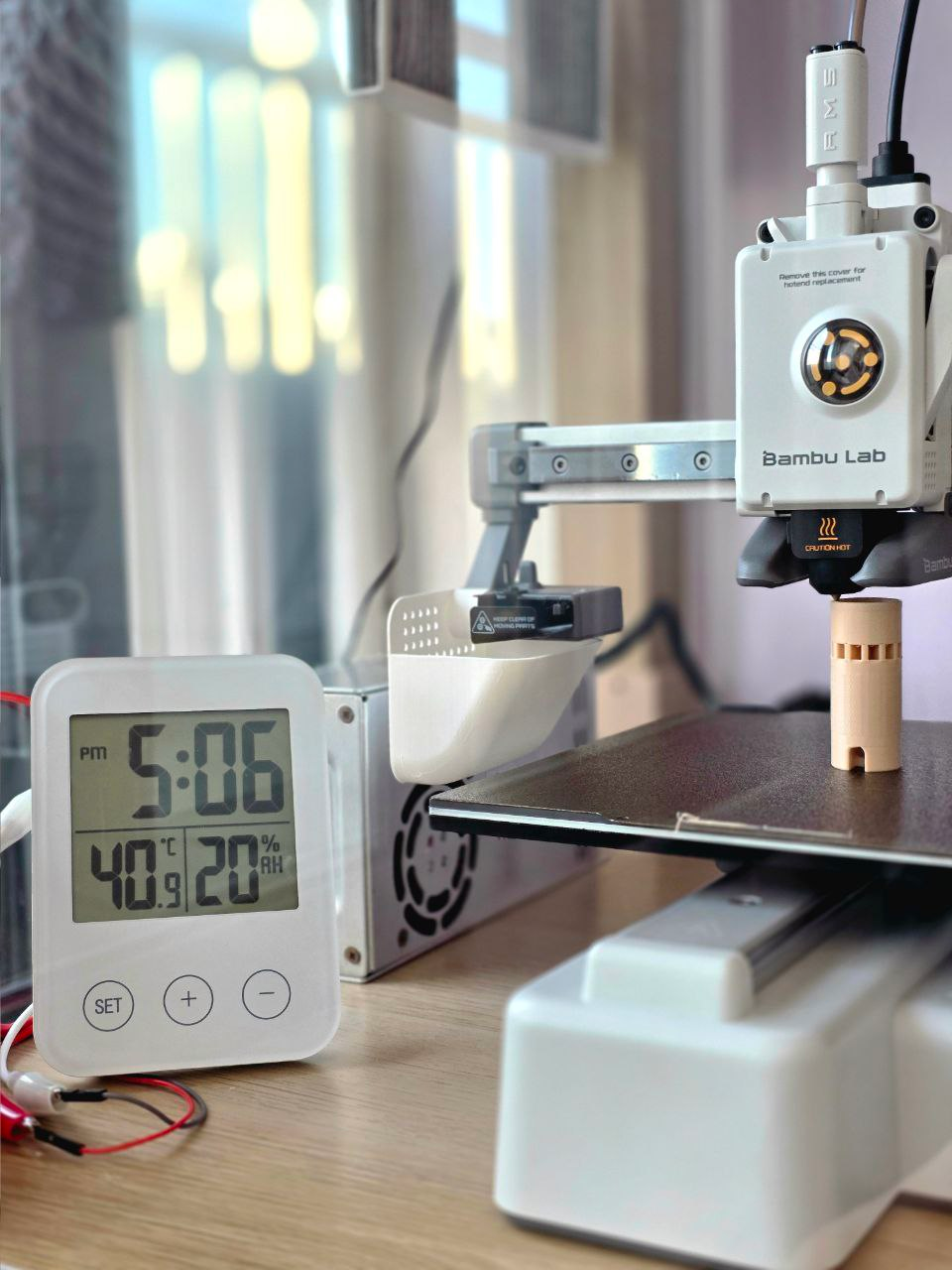 이제 24시간, 계절 상관없이 3D프린터를 돌릴 수 있는 챔버를 완성했습니다! 챔버 내부 온도를 알 수 있도록 온도계를 넣어줬습니다.