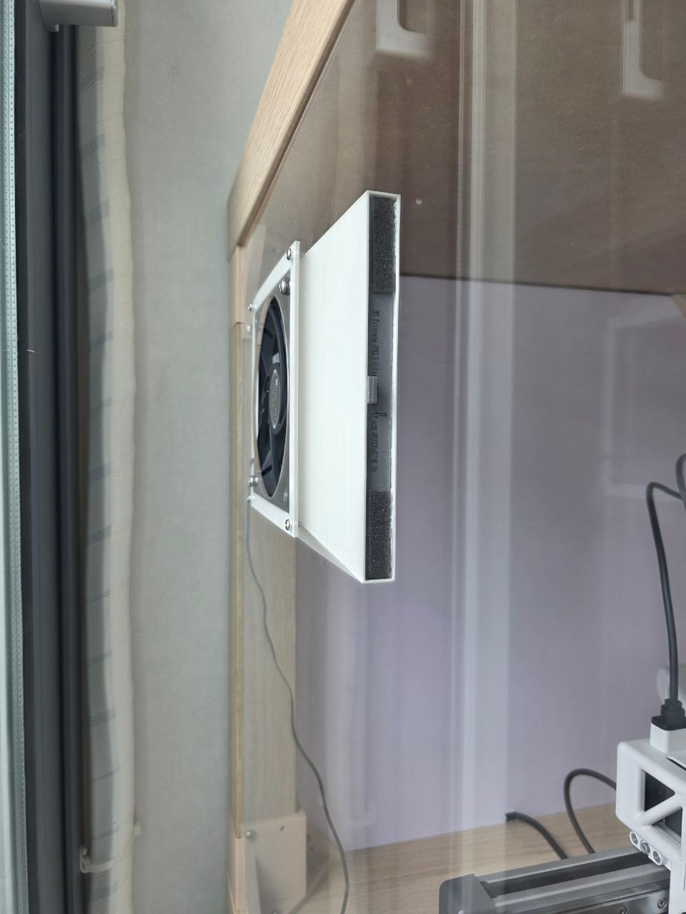 플라스틱을 녹이면서 유해가스가 발생합니다. PLA 재료 사용 시 포름알데히드가 발생하는데 창문 밖으로 강제 배기 하기 위해 팬을 사용해서 환기 장치를 만들었습니다. 챔버의 모든 틈새를 막고 음압 환경을 만들면 완벽한 배기 환경을 만들 수 있는데 포름알데히드는 단순 자연 환기로도 괜찮은 수준이라서 틈새를 완벽하게 막지는 않았습니다.