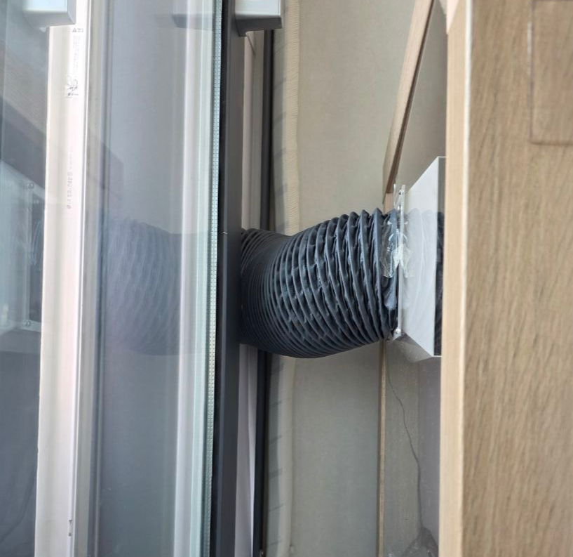 플라스틱이나 폼을 사용해서 창문을 막고 주름관만 밖으로 뺄 수 있도록 만들어줍니다. 여기서는 알루미늄 판과 가공할 기회도 생겨서 따로 창문 막이를 구매하거나 만들지는 않았습니다. 알루미늄은 크기 때문에 탈부착하기가 번거롭고 특유의 쇠 냄새가 있어서 개인적으로는 폼을 추천드립니다. (폼이 더 가공하기도 쉽고요!)